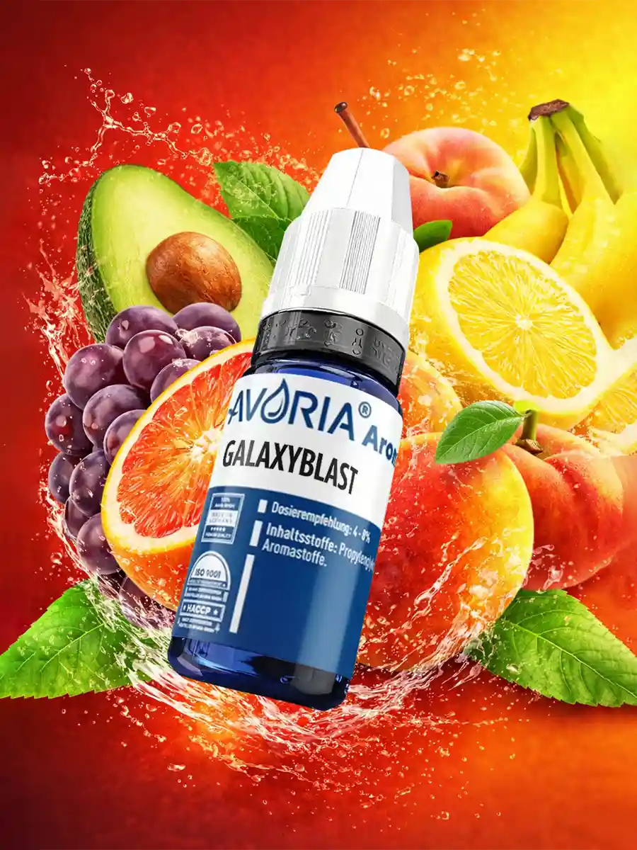 Das Galaxyblast Aroma Konzentrat von Avoria ist ein intergalaktischer Fruchtmix aus Banane, Pfirsich, Orange und Aprikose.