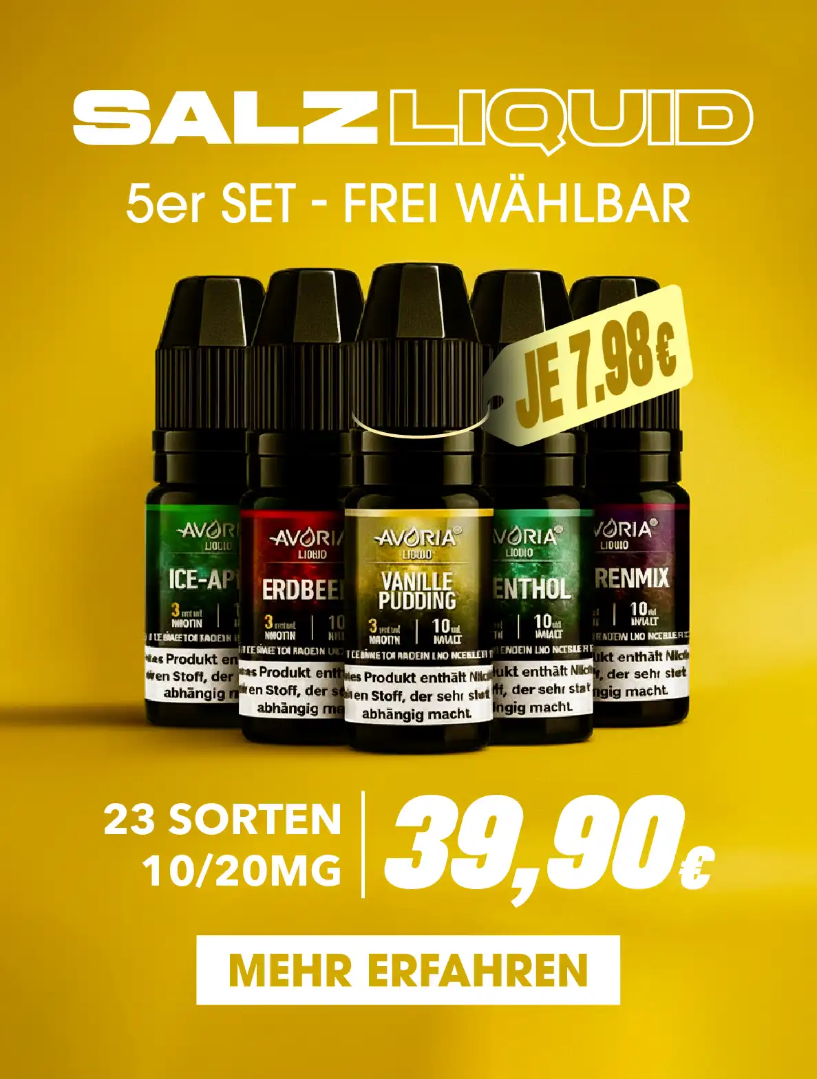 Erlebe die beste Auswahl an Avoria Nikotinsalz Liquids in einem exklusiven 5er Probierset! Dieses Bundle wurde speziell für Dampfer entwickelt, die höchste Qualität und eine abwechslungsreiche Geschmacksauswahl schätzen. Ob fruchtig, süß, erfrischend oder klassisch – mit diesem Paket findest du deinen neuen Favoriten.